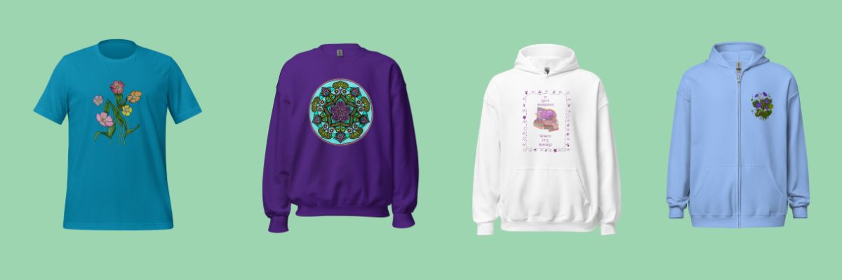 Shop this collection of beautiful, comfy apparel, featuring Tora Moon’s Mystical Mandalas, Playful Botanicals, and Fun book related art.