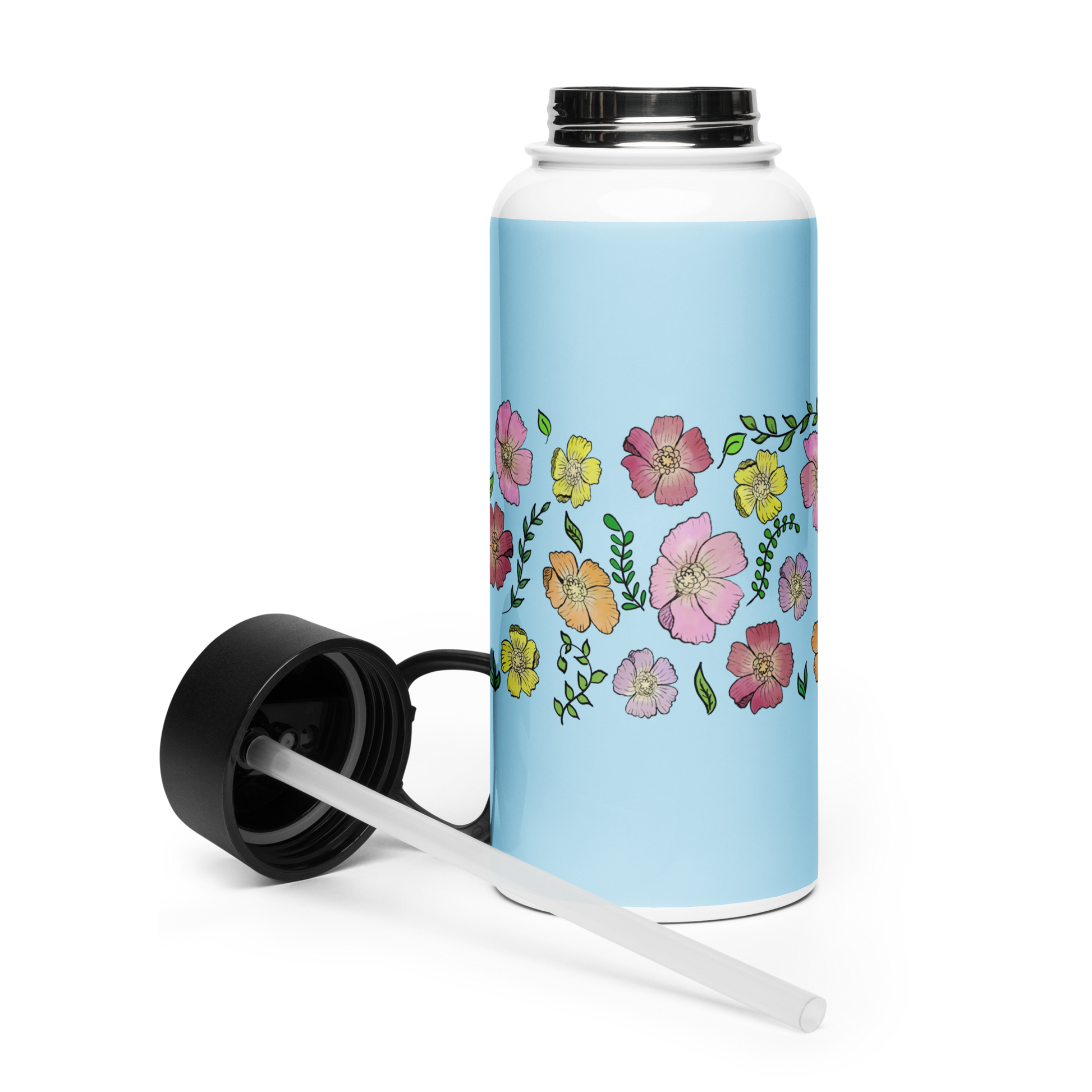 Stay refreshed with the vibrant energy of nature with this Cosmos 32-oz Stainless Steel Water Bottle. This beautiful water bottle includes a straw lid and features a scattering of vibrant cosmos flowers, hand-drawn by Tora, in shades of lavender, pink, mauve, orange, and yellow on an ocean blue background. Each flower exudes a carefree, joyful energy, bringing a sense of playfulness to your daily hydration.