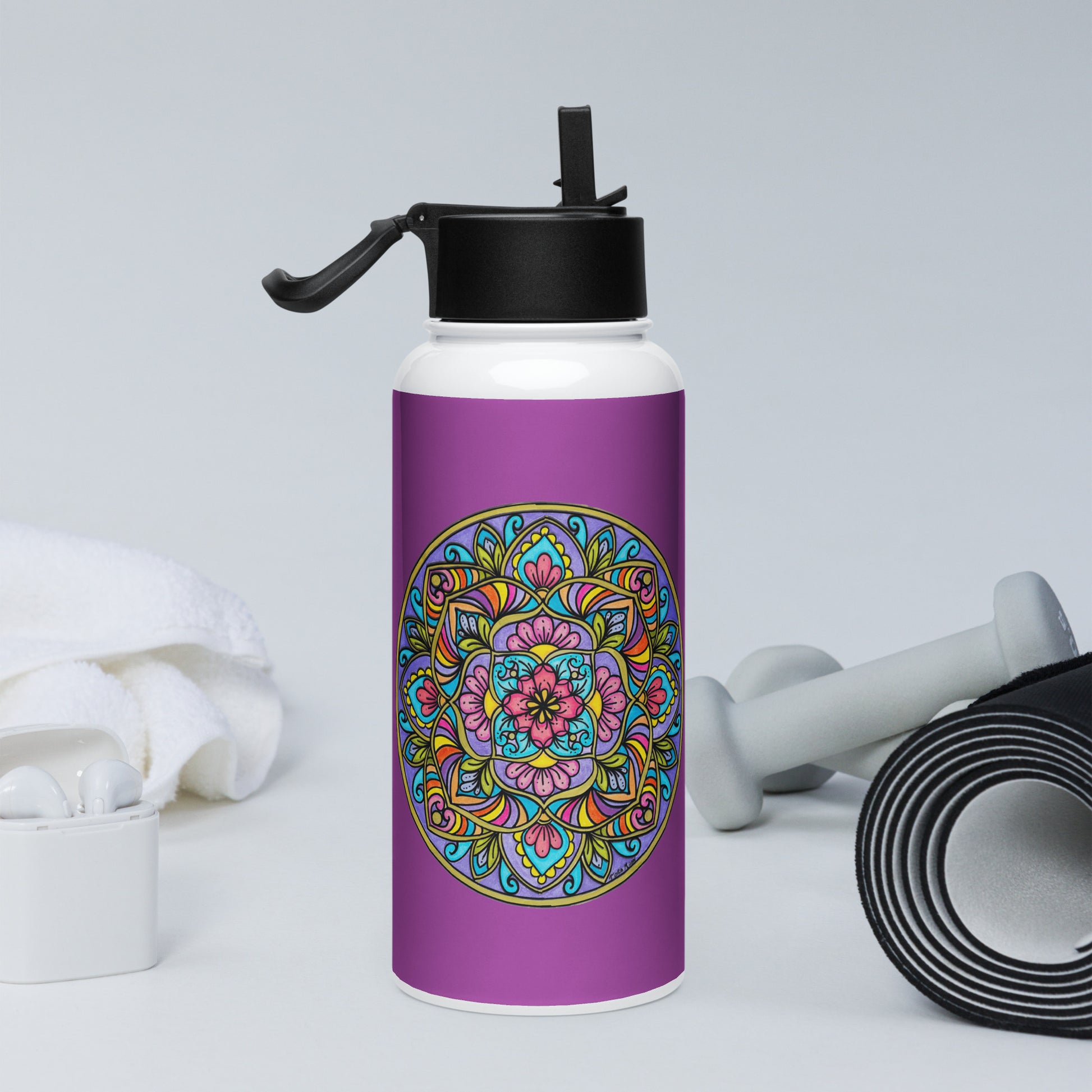 Take your favorite beverage with you in this Floral Scrolls Mandala 32-oz Stainless Steel Water Bottle. This luxurious water bottle includes a straw lid and features Tora's pretty pink and red floral hand-drawn mandala on a dark lilac background. Framed by intricate scrolls in ocean blue, purple, pink, yellow, and orange, the mandala petals shimmering with gold, adding a touch of luxury to your favorite beverages.
