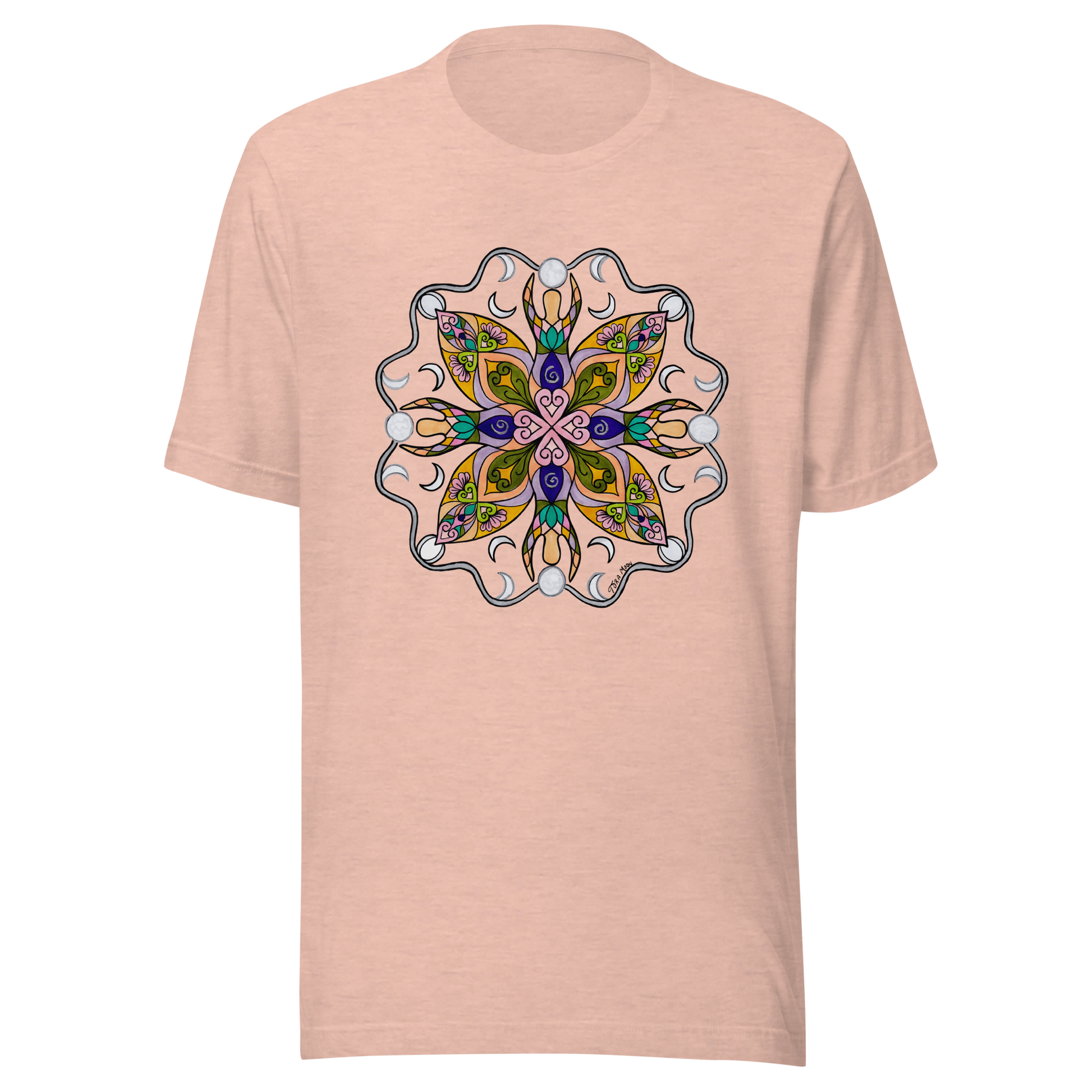 Channel Your Inner Divine Feminine with this Moonlit Goddess Mandala T-shirt. Celebrate the power of the moon and the sacred feminine. Tora's hand-drawn design features four goddesses drawing down the moon. Their arms raised in reverence connects you to the cyclical rhythms of the cosmos. A spiral at the heart of each goddess symbolizes the Feminine Divine within, grounding you in your personal power. Framed by crescent moons and soft petals adorned with heart-shaped leaves, this mandala radiates love and lunar energy in vibrant shades of pink, lavender, sage green, turquoise, and orange.